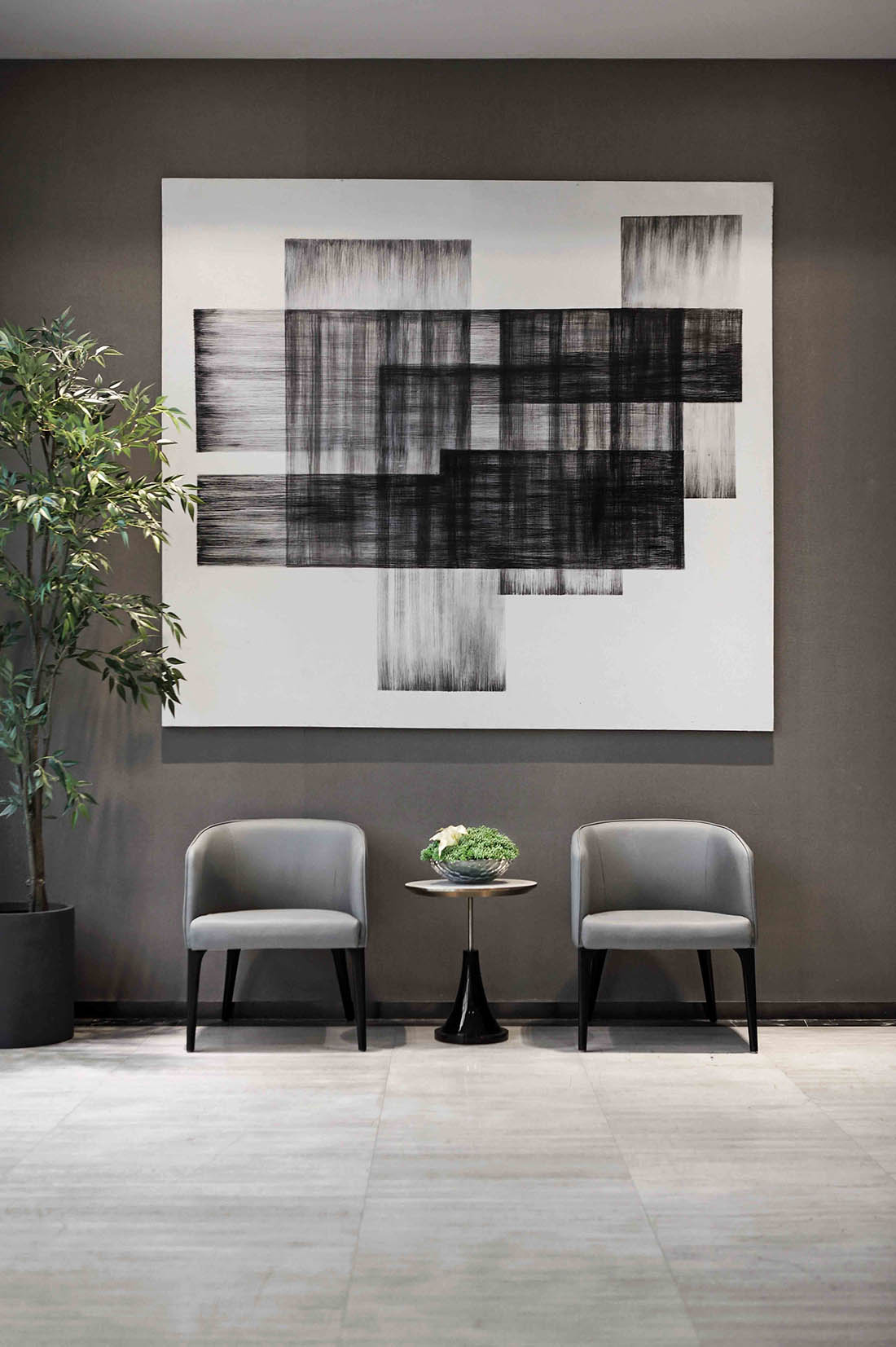不銹鋼線條,硬包,實木地板,灰色大理石,藝術涂料等